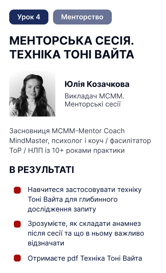 Так. Ви дізнаєтесь більше про робочі рамки мислення, безпечні підходи та отримаєте інструменти для сесій.